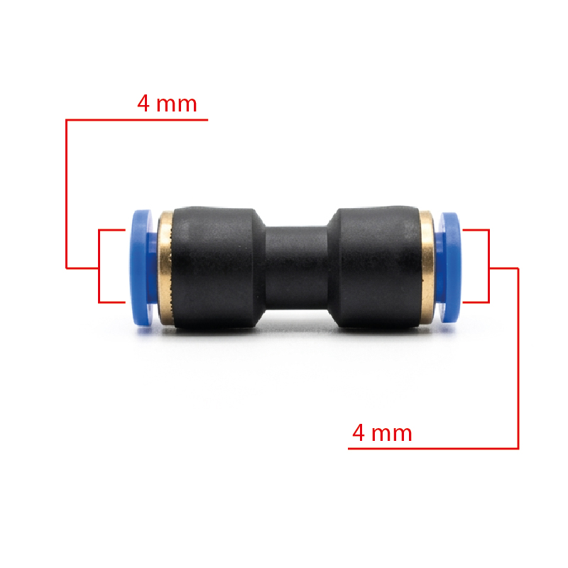 Conector diseñado para unir dos tuberías o mangueras del mismo diámetro (4 mm), permitiendo una conexión firme, segura y sin fugas en sistemas de conducción de aire o fluidos.