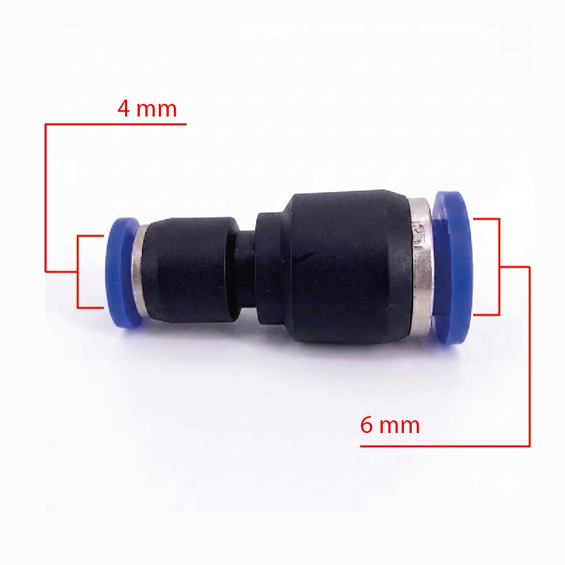 Conector diseñado para unir tuberías o mangueras de distinto diámetro, permitiendo la transición de 6 mm a 4 mm de forma segura, garantizando un ajuste hermético y eficiente en sistemas de conducción de fluidos o aire.