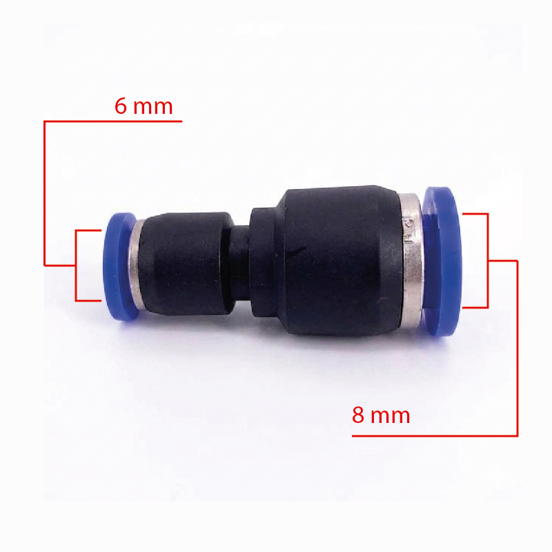 Conector diseñado para unir tuberías o mangueras de distinto diámetro, permitiendo la transición de 8 mm a 6 mm de forma segura, garantizando un ajuste hermético y eficiente en sistemas de conducción de fluidos o aire.