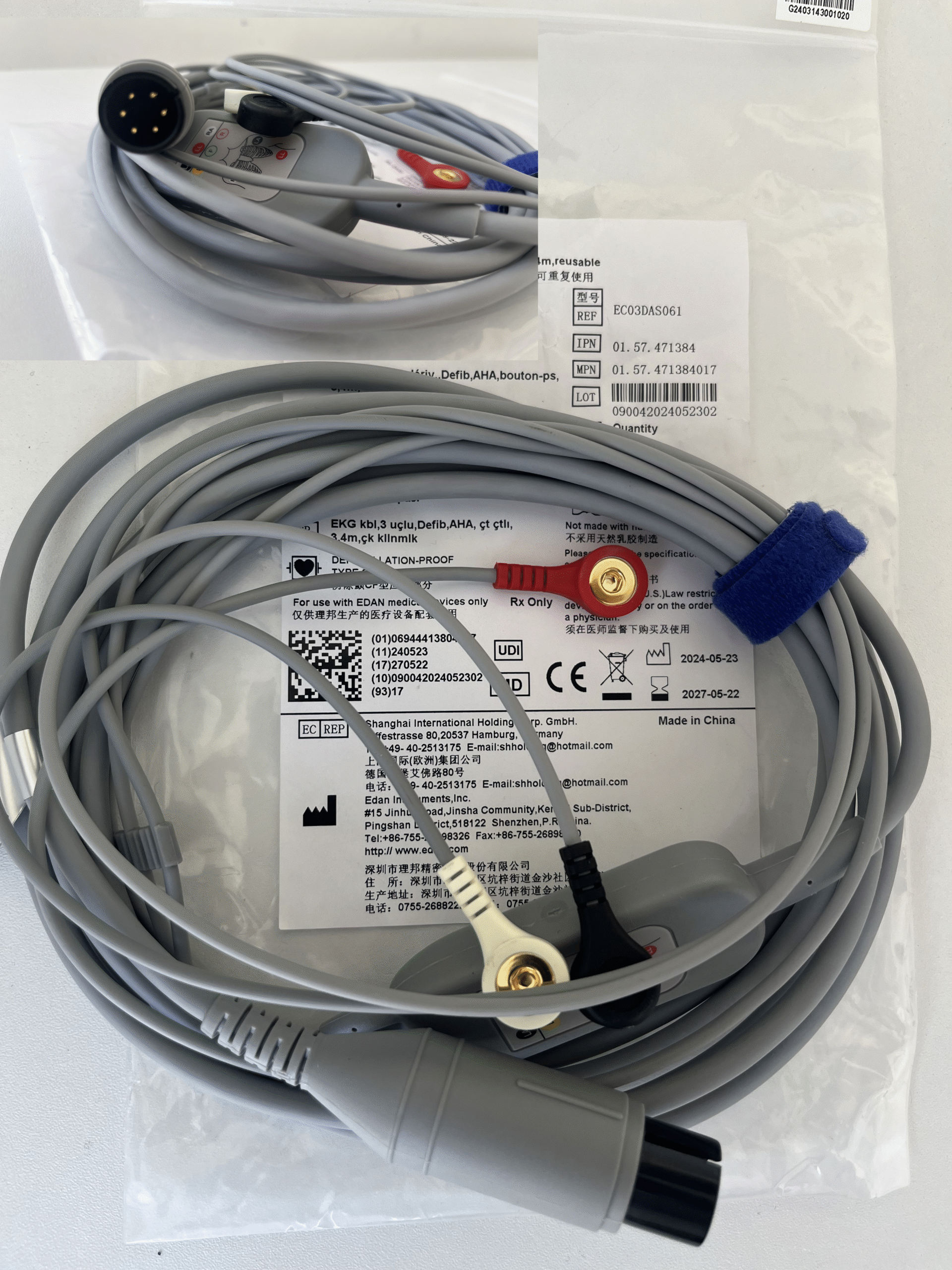 Cable ECG, 3 derv., Defib., AHA, boton, 3,4m, reutil.