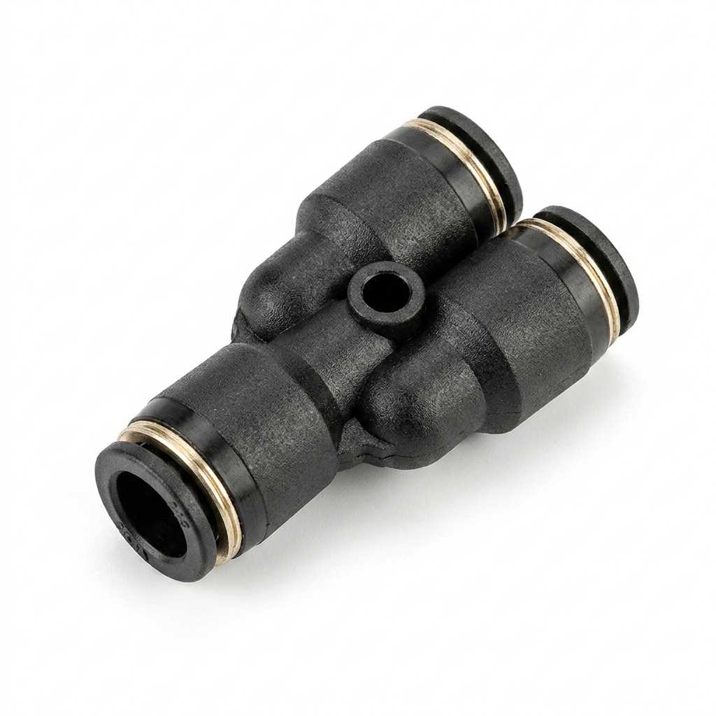 Conector tipo “Y” para distribución de aire en múltiples salidas. Ideal para sistemas odontológicos que requieren derivaciones eficientes sin pérdida de presión.